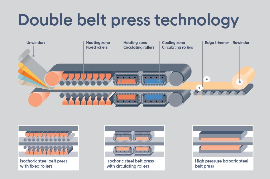 スチールベルトを用いたダブルベルトプレスは加圧下で加熱・冷却を連続的に行う大量生産用装置である。