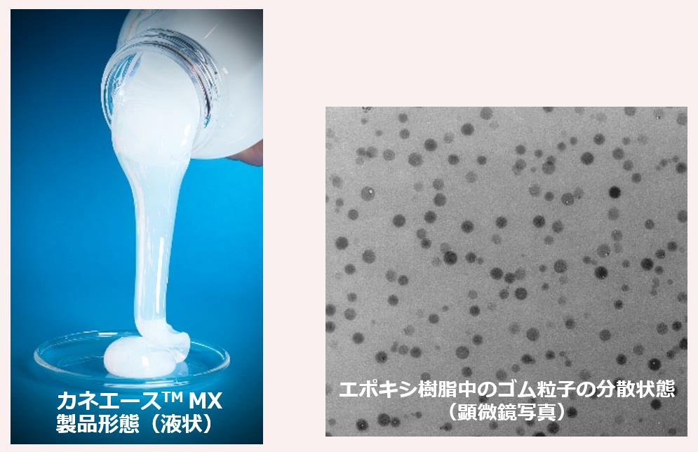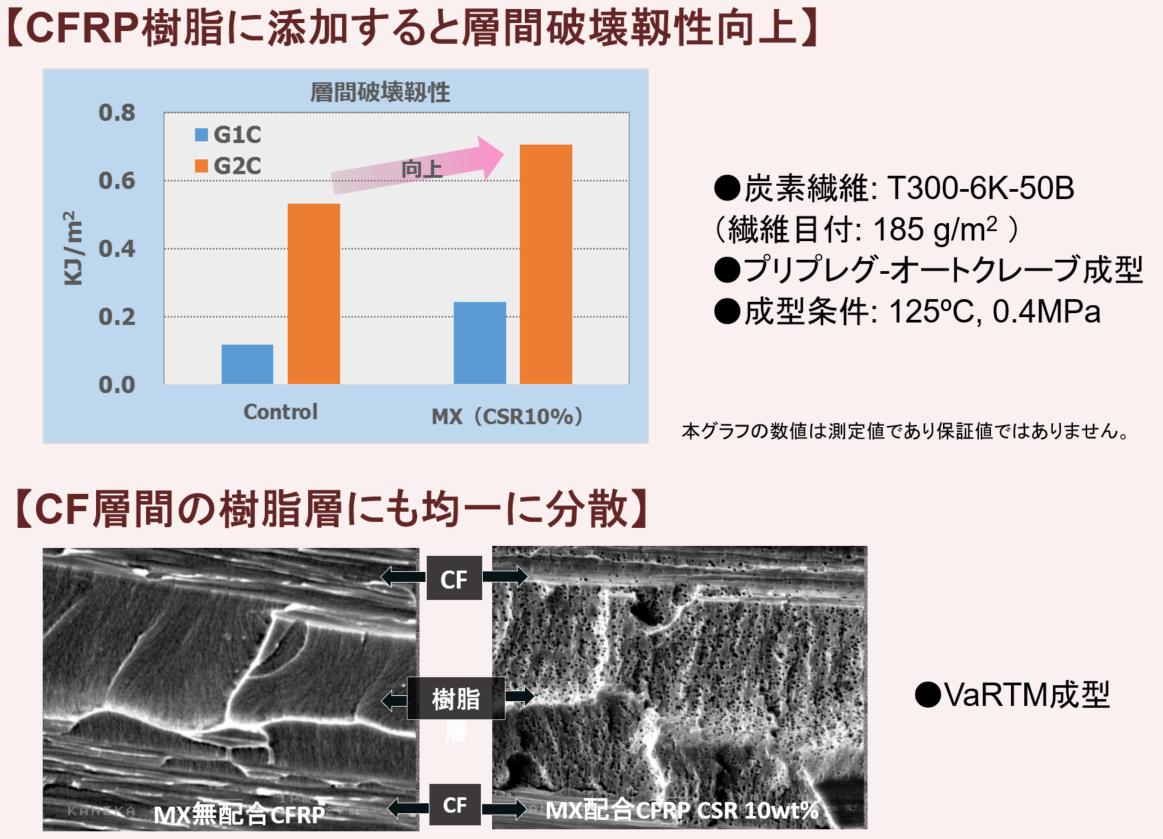 100nmレベルのゴム粒子(CSR)をエポキシ樹脂中に均一に分散できる、マスターバッチ型の液状添加剤。繊維への樹脂含浸中にフィルタリングされることなく、繊維層内部にまでCSRを均等に行き渡らせることができ、安定して高い機械特性を発現する。