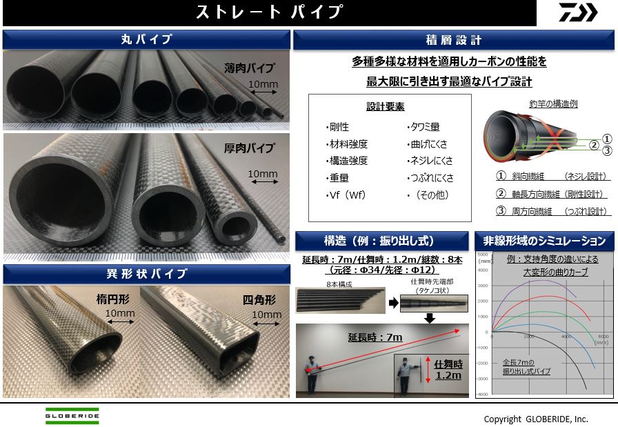 ~ ~ 釣竿で培った設計ノウハウを基に軽量化や高強度化、高度な剛性設計を必要とする一般産業資材への展開を検討して参ります。~ ~