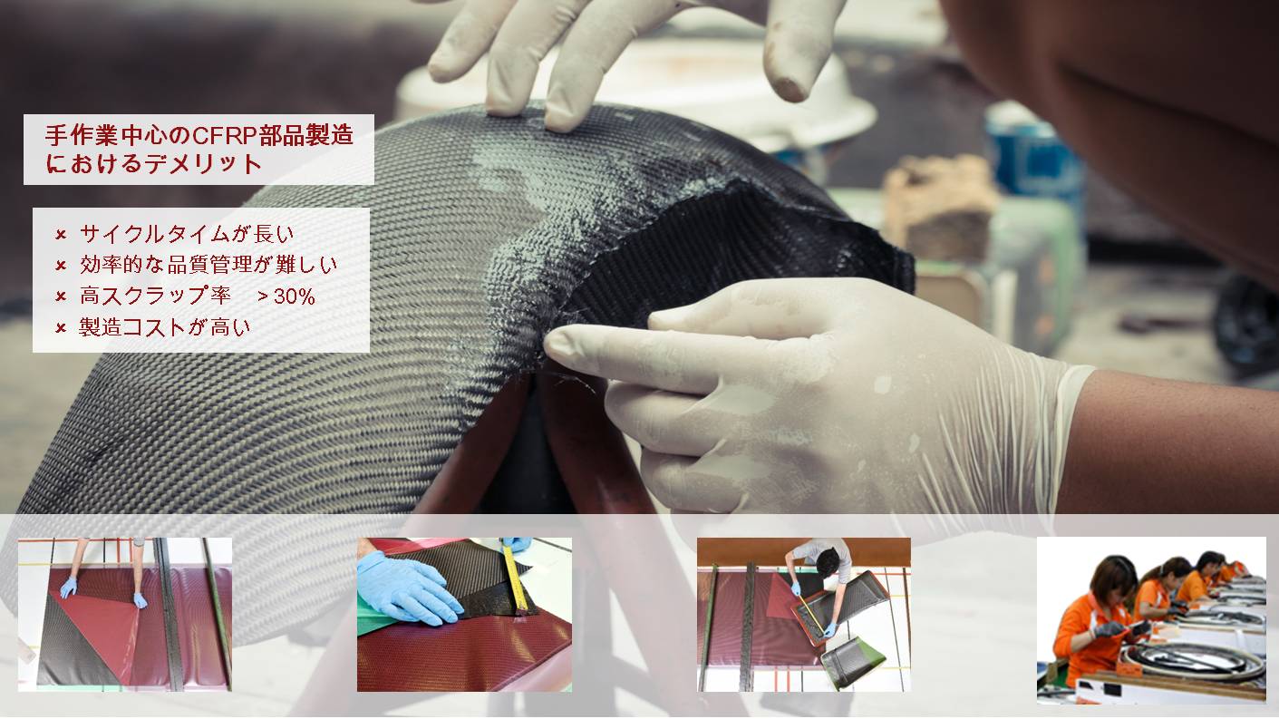 複合材を用いた複雑形状部品における従来の複合材積層工程では、裁断機によりCFRP等のシートを各プライ毎に切り出し、レーザープロジェクターやマイラーなどのテンプレートに合わせて1枚ずつ人の手で積層しており、それぞれの工程で付帯設備の購入やプログラム作成にコストと時間を費やしていた。