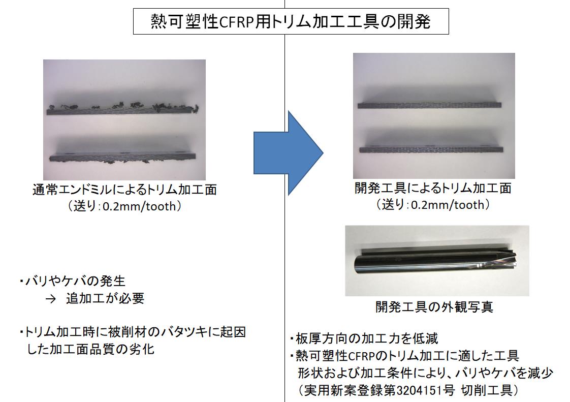 | 技術課題・制約 | ・CFRPの加工では工具摩耗が激しく、バリやケバが発生し品質の低下の原因となっており、コーティング技術によってこれが改善されれば生産性がさらに向上する見込み。