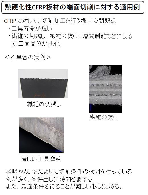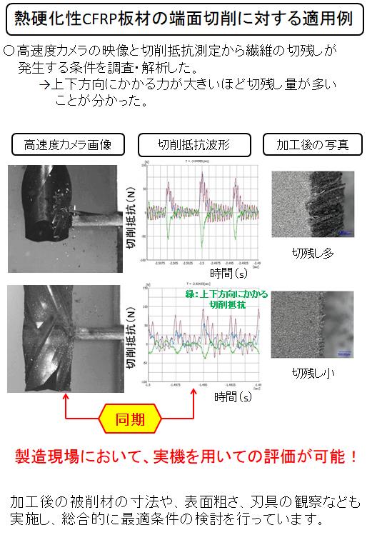 | 技術課題・制約 | ・高速度カメラは、切削点を観察するため、加工機のカバー等を取り外す必要がある。カメラや周辺機器を設置するスペースが必要。また、切削油剤を用いた加工は観察できない。