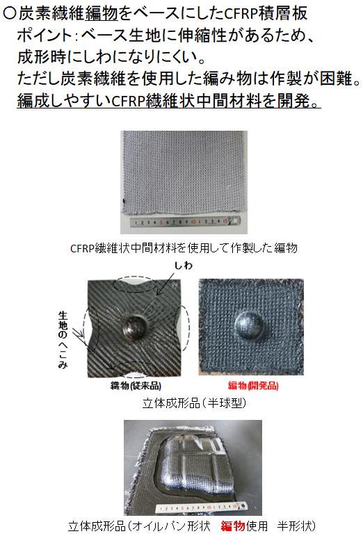 | 必要な連携先 | 編物をベースにしたCFRP積層板の立体成形、及び商品化に取り組んでいただける企業