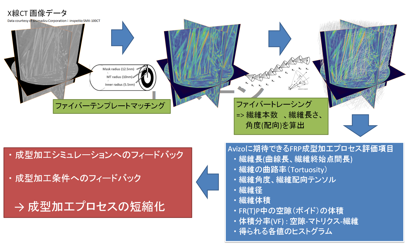 [ X線CT、画像処理、FRP内部繊維構造解析、繊維配向、繊維長、繊維径、FRP成型プロセスシミュレーションの最適化、画像処理における機械学習 ]