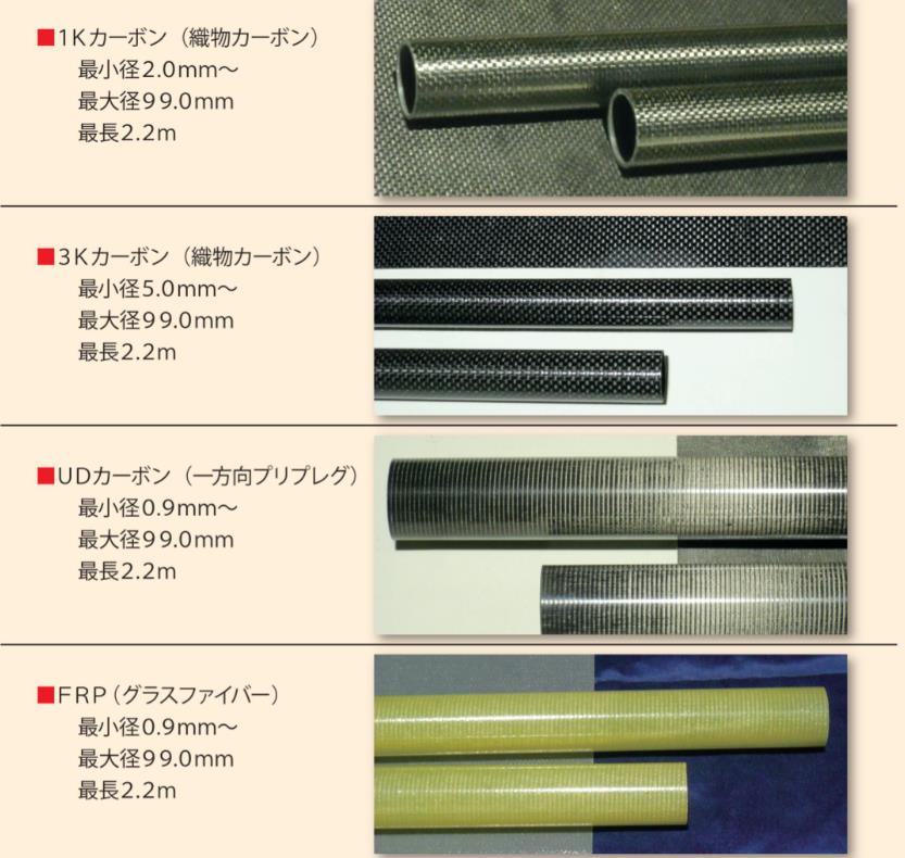 カーボンファイバーやグラスファイバーのパイプ成形(各種サイズ、形状)を中心に、新しい素材の可能性を求めて、お客様のご希望に応じた商品を素早く、確実に供給させて頂きます。