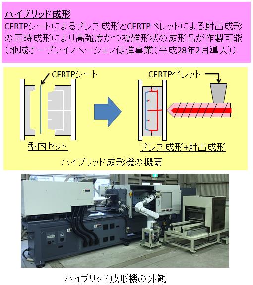 炭素繊維強化熱可塑性樹脂(CFRTP)の複雑形状かつ高強度な部品を作製可能な成形方法である、シートおよびペレットによるハイブリッド成形により、試作支援等に取り組む。