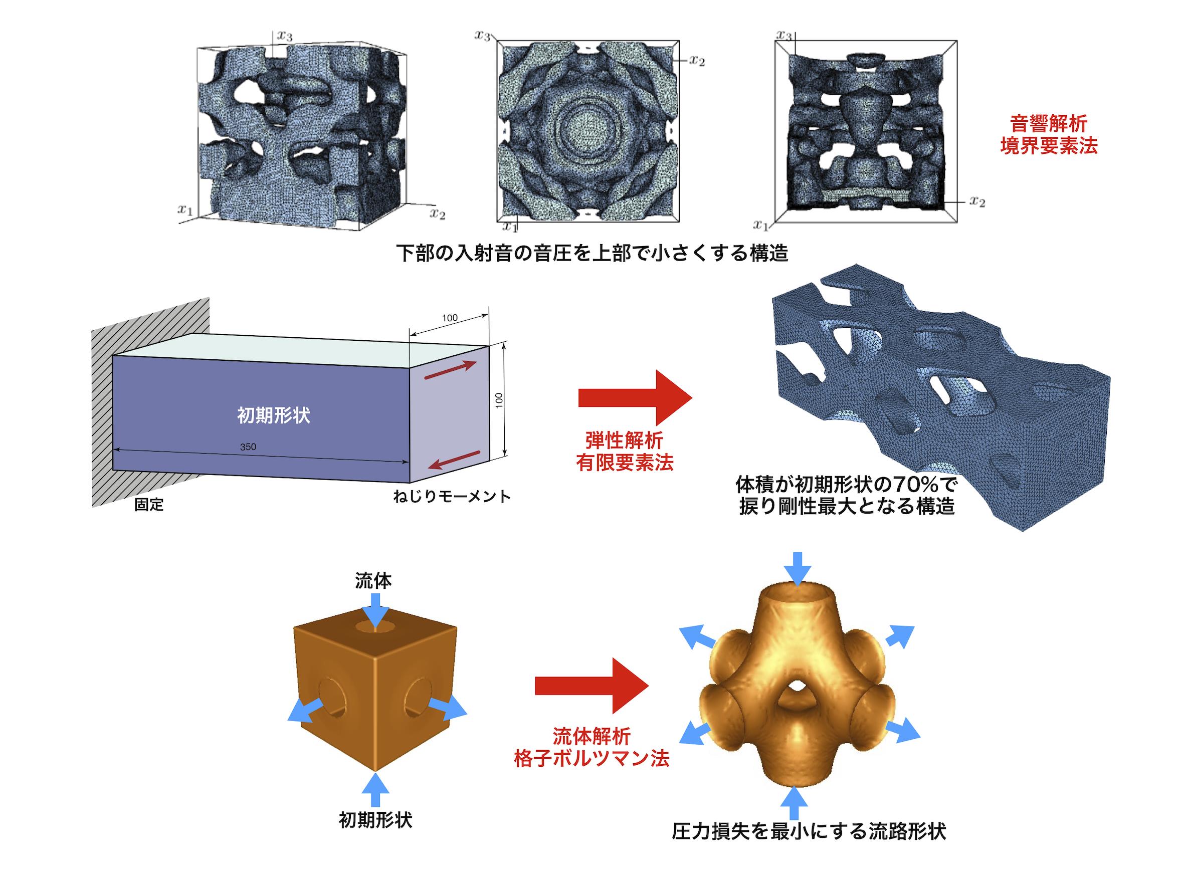 構造の体積を減らしつつ剛性を最大化する形状を最適化を最適化する技術、車室内・ホールなどの静音化や音響特性を最適化する音場形状の最適化技術、固有振動数が最適な値となるように逆に構造の形状を決定する技術、電場・磁場強度をコントロールする誘電体・散乱体の形状の最適化技術、金型キャビティーの温度をより高精度にコントロールするための3Dプリンタを志向した冷却管の形状や配置の最適化技術、圧力損失を最小化・最大化できる流路の形状・トポロジー最適化技術など、有限要素法・境界要素法・格子ボルツマン法をレベルセット法と組み合わせた高度な構造最適化手法を開発している。計算の過程で、構造をメッシュに分割し直しており、計算は高精度に行われ、得られた形状から3Dプリンター用のSTLデータは直接出力される。また、従来の方法では精度が低い固有振動数を最適化するトポロジー最適化も高精度に実行することが可能となる。