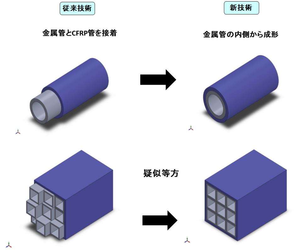・市販の金属管の内側からCFRPを成形することにより有益な効果が得られる。