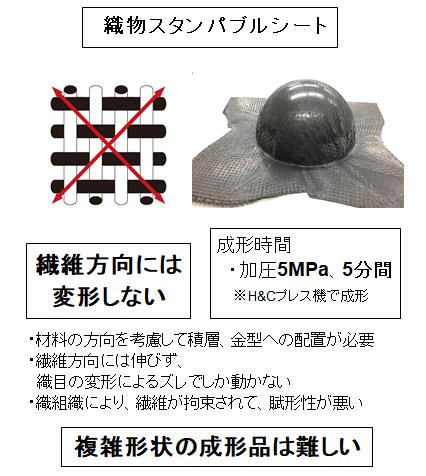 従来の織物に比べ深堀、小コーナーRの賦形性に優れる