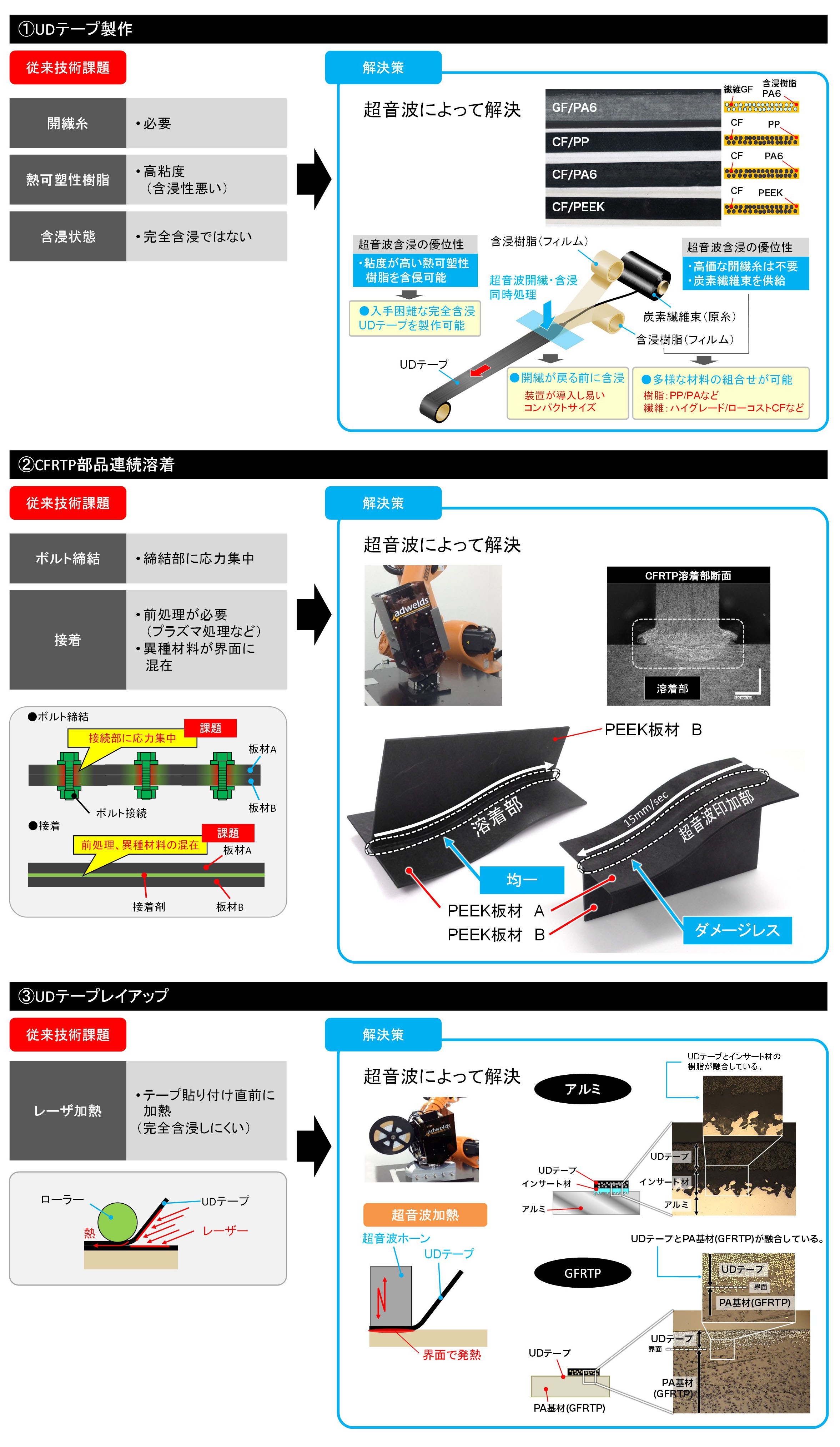 超音波による樹脂溶着(UDテープ樹脂含浸・CFRTP部品連続溶着・UDテープレイアップ)