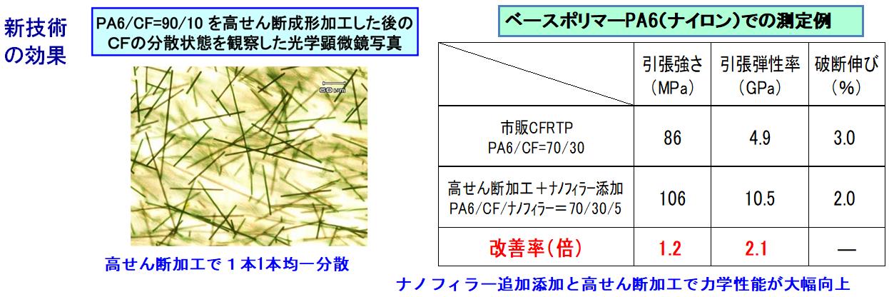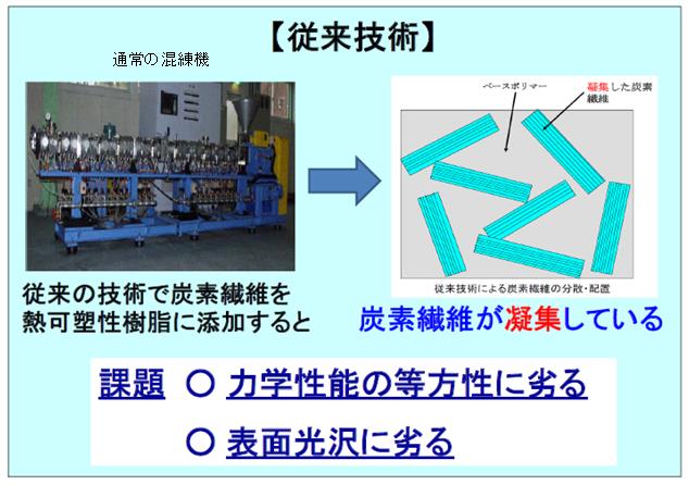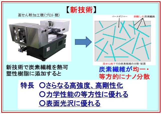 ・開発した高せん断加工法により、炭素繊維の凝集を解放し、ベースポリマー中に均一かつ等方的な