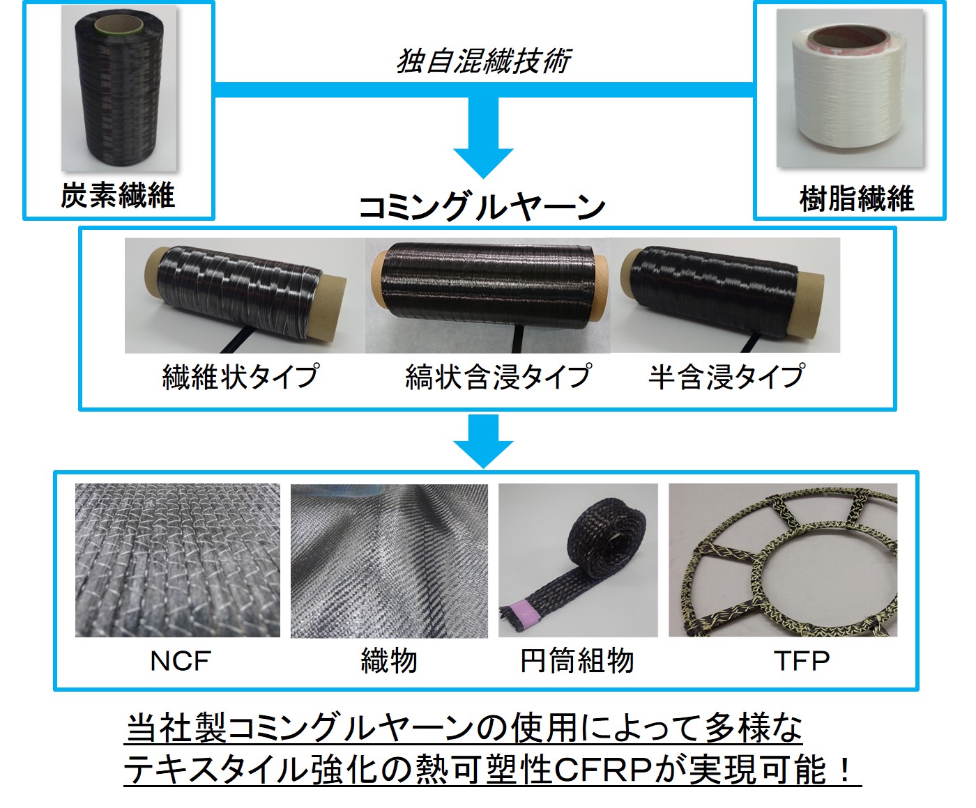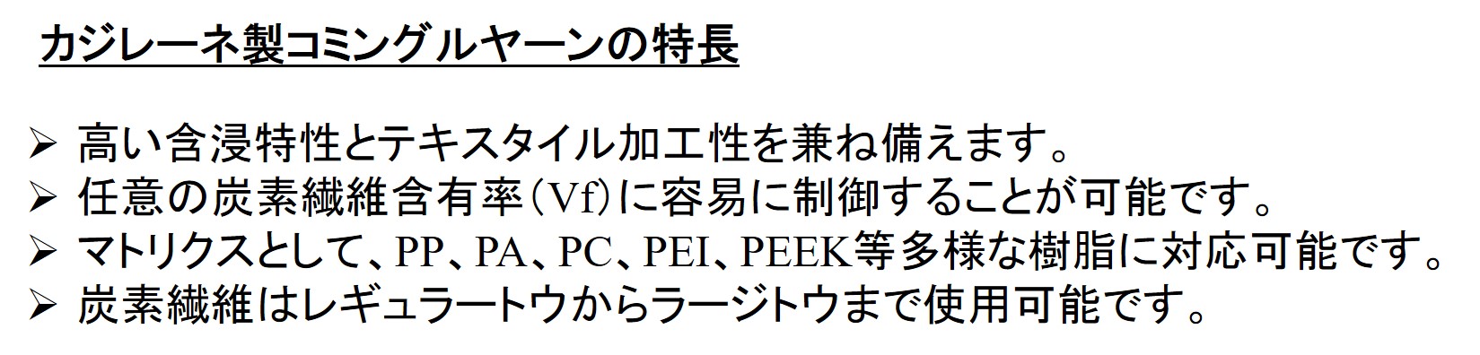 | 技術課題・制約 | ・繊維状、縞状含浸もしくは半含浸コミングルヤーンの形態で提供となります。