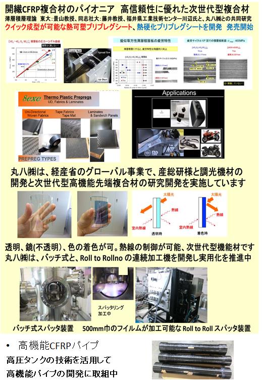 | 生産品目 | 繊維強化複合材料/ 基材(クロス材・ニット材) プリプレグ材(UD材・クロス材:熱硬化性タイプ・熱可塑性タイプ) プリフォーム材(2D:積層板材・テイラードスタック、3D:3次元フォーミング品・ATL(テープレイアップ)積層品・部分補強品) FW成形品(CFRP高圧容器・高圧パイプなど、受託評価試験(高圧バースト試験、サイクル試験など)) |