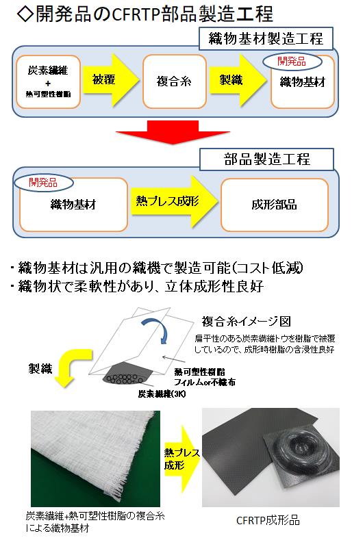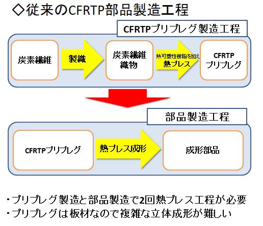 ・織物基材から直接CFRTP部品の成形が可能なので、CFRTPプリプレグの製造工程が不要
